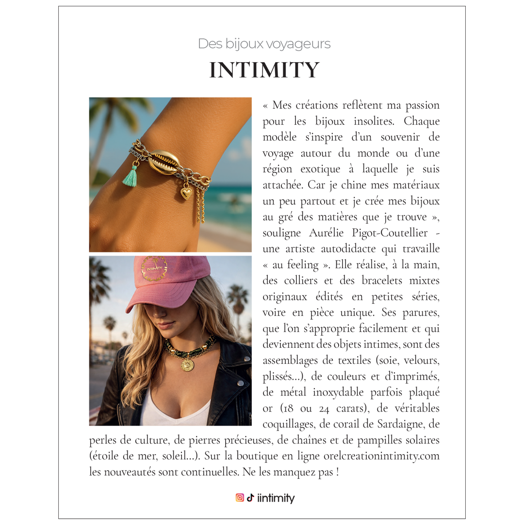 Chez INTIMITY, chaque bijou est une invitation à révéler votre personnalité. Nous vous proposons une large sélection de créations qui allient élégance, originalité et modernité : du style bohème au chic raffiné, du design contemporain aux touches funky et estivales.